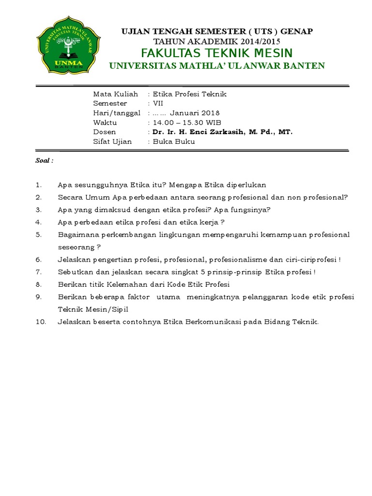 Teknik Informatika Soal Uts Etika Profesi from data03.123doks.com Soal dan jawaban uts etika profesi. We did not find results for: Maybe you would like to learn more about one of these? Check spelling or type a new query.